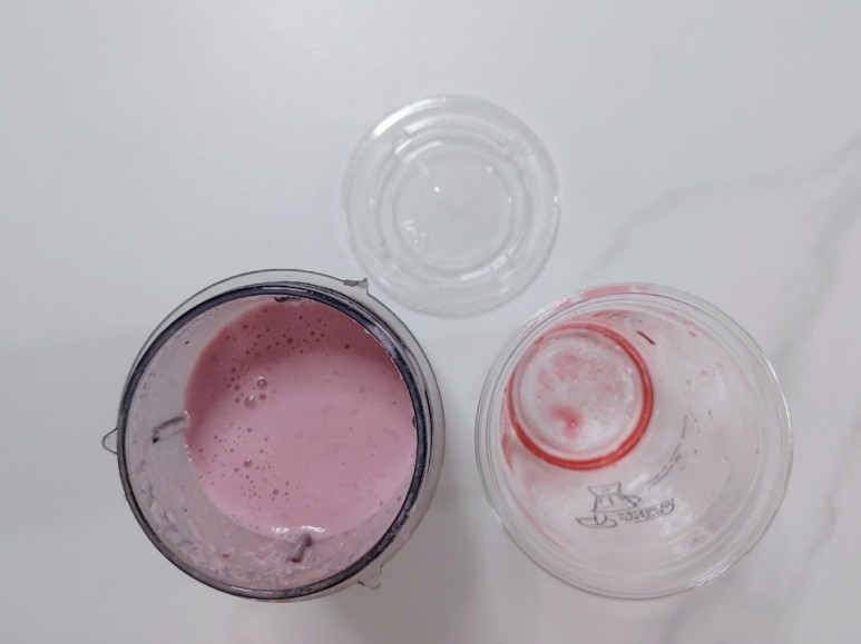 그 뒤엔 아까 사용한 스무디 통에 믹서기를 통해 갈아준 내용물을 옮겨담아주세요!!