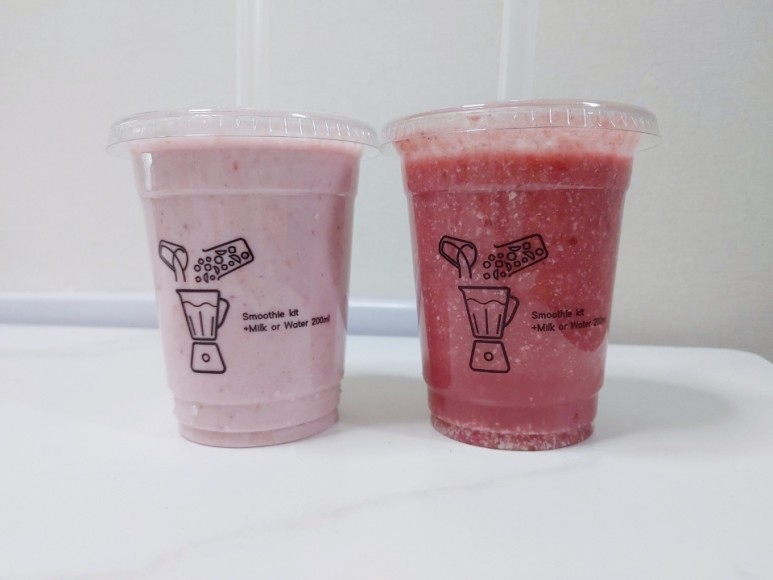 제가 각각 담은 후 물로 만든 스무디 맛과 우유로 만든 스무디 맛을 비교해보았는데요!!