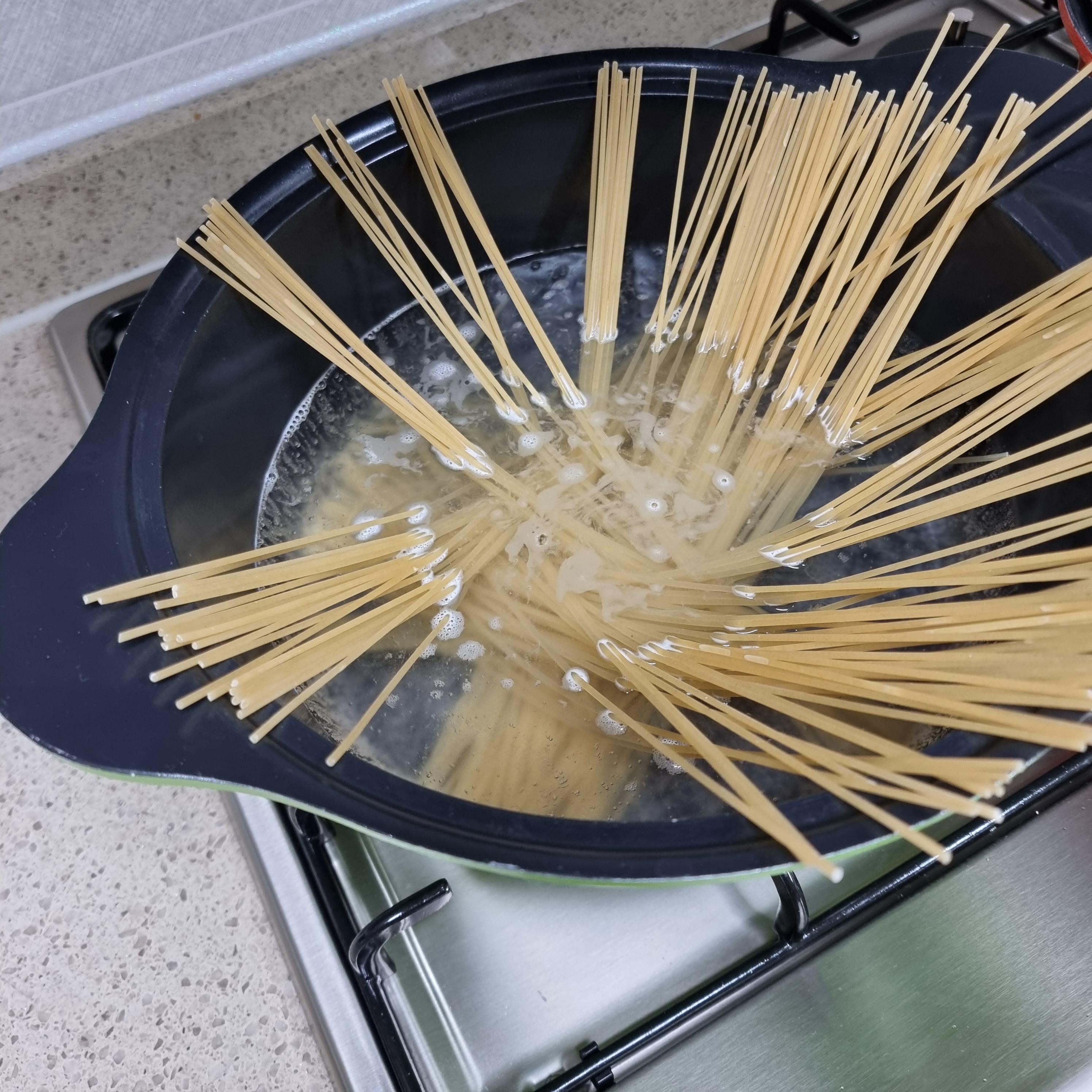 위에 그림처럼 스파게티면을 골구로 펼치며 넣어줍니다.